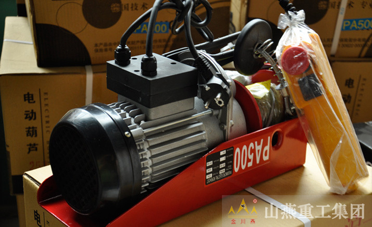PA500微型電動葫蘆為山燕重工主打微型電動葫蘆之一,分運行式微型電動葫蘆與固定式微型電動葫蘆,可選擇單鉤或者雙鉤版本。單鉤額定起重量為250kg,起升速度10m/min,起升高度可達(dá)12m;PA500雙鉤微型電動葫蘆額定起重量可達(dá)500kg,起升速度5m/min,起升高度5m。